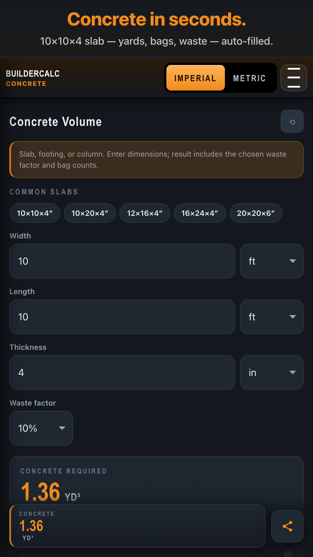 One calculator, four pours. Slab volume + bag count, continuous + spread footings with rebar callouts, round/square columns, and round piers. Cubic yards or cubic meters. Bag count for 80 / 60 / 40 lb premix at typical manufacturer yields.