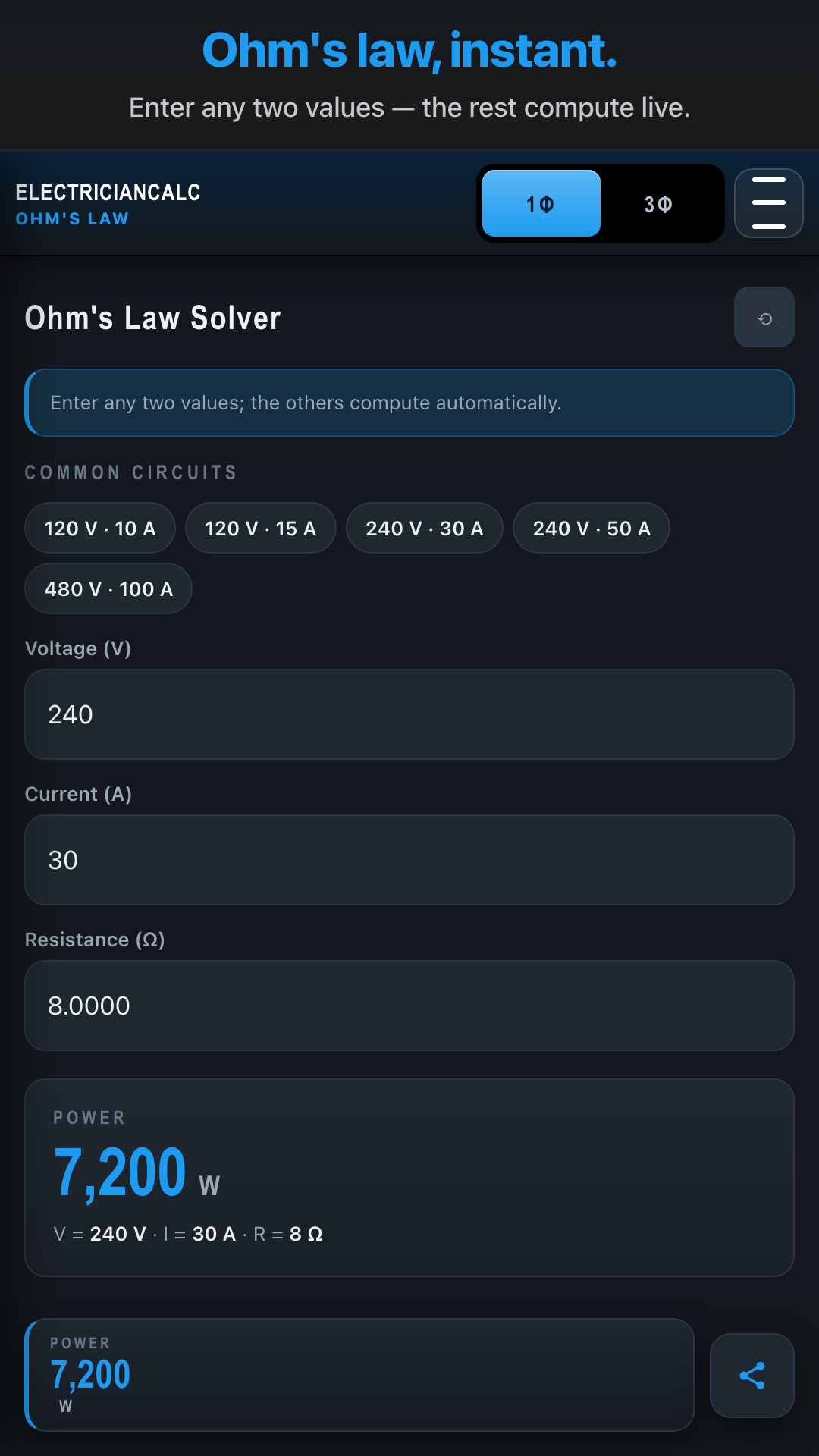 Ohm's Law — 1Φ + 3Φ in one tap