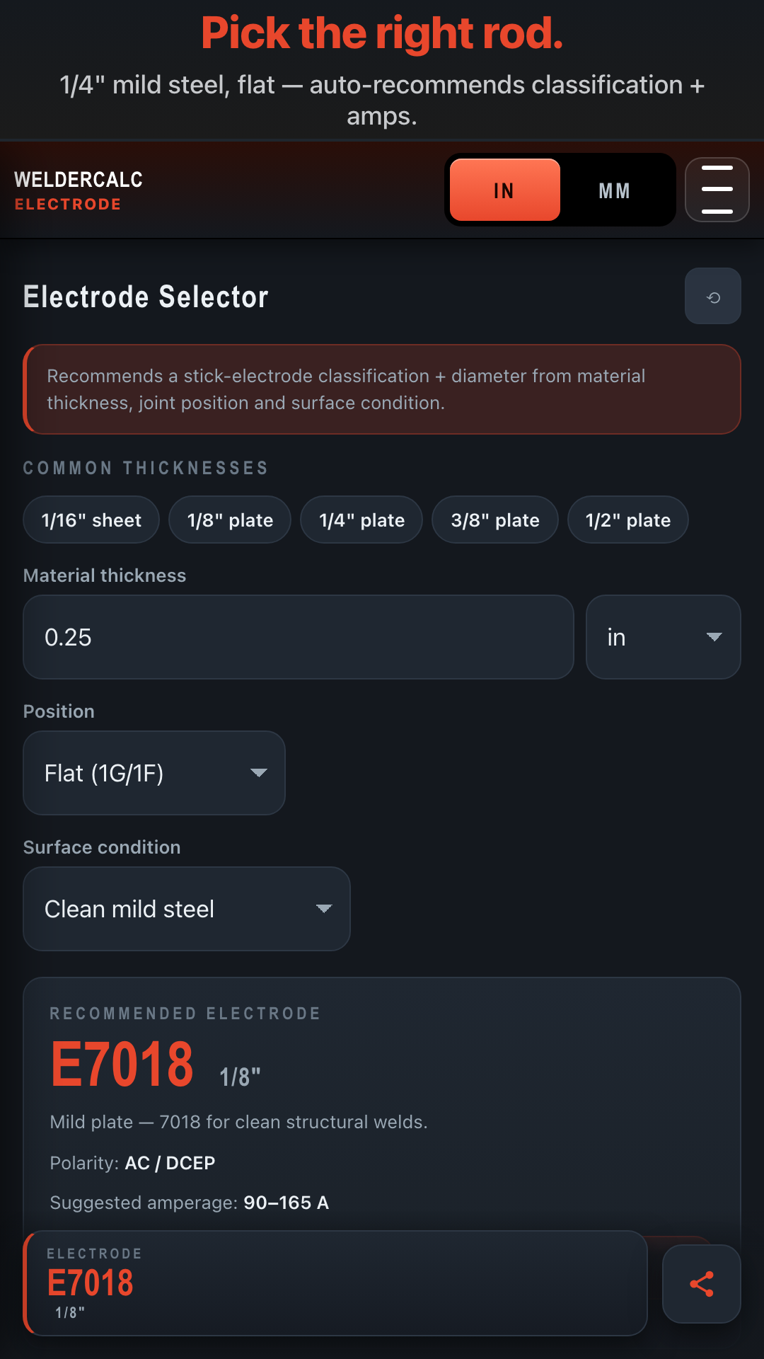 E6010, E6011, E6013, E7018, plus E7024 for flat / horizontal. Pick surface condition (clean vs rusty/galvanized) and joint position; get the recommended electrode and diameter.